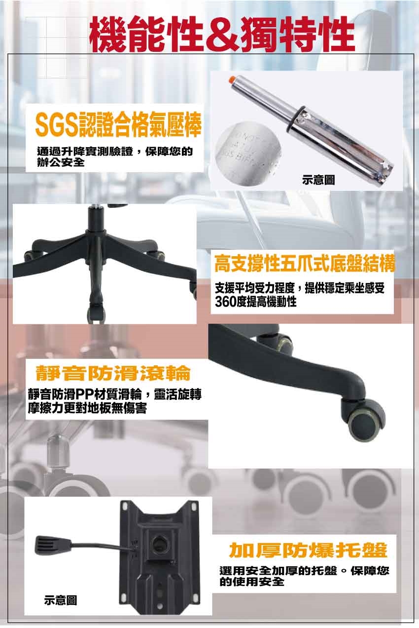 材質:高剛性PP材質+高透氣強韌網布+五抓式底盤+防爆托盤架+高磅數氣壓棒+靜音防滑滾輪
