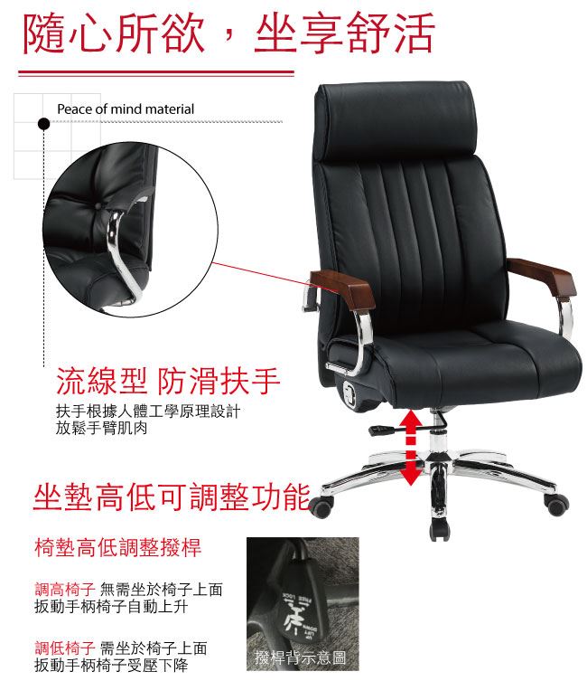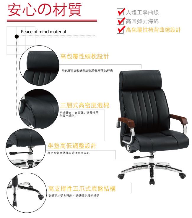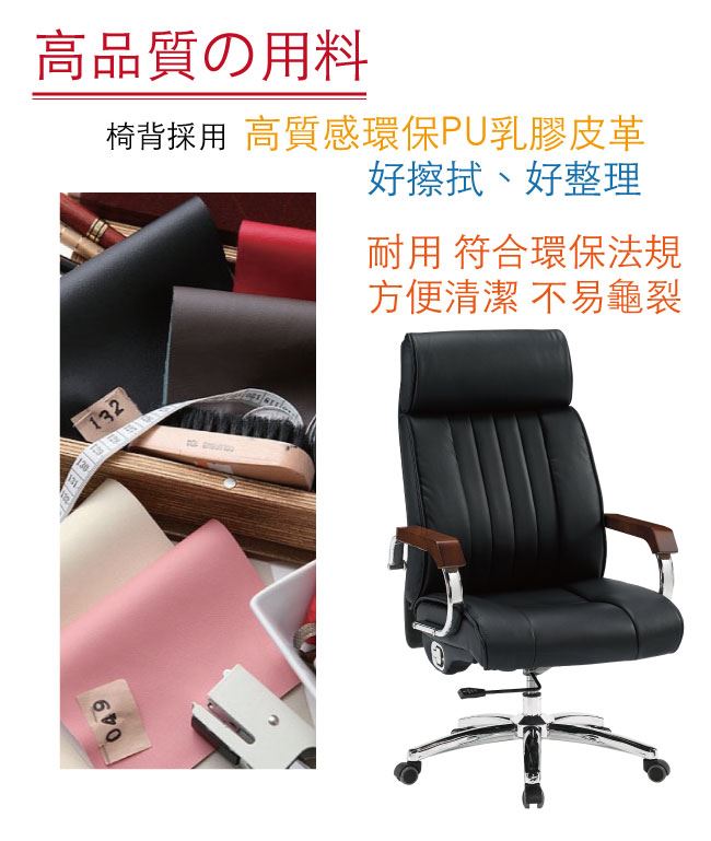 商品介紹 | 【綠家居】德爾 黑高背皮革椅墊辦公椅 材質採用高密度高彈性泡棉+不鏽鋼五金&腳座+不鏽鋼五金腳座&靜音PP材質滾輪+SGS認證合格氣壓棒+防爆托盤裝置+高支撐性五爪式底盤結構+雙層式柔舒椅墊等安心材質,另備有可調式椅背+椅身高低調整撥桿等機能性設計。產品免組裝+全由專人配送到家,專業安心服務,替你省下更多時間! 【商品特色】 高密度高彈性泡棉+不鏽鋼五金材質椅身安心材質製造 不鏽鋼五金腳座&靜音PP材質滾輪+SGS認證合格氣壓棒安心材質製造 防爆托盤裝置+高支撐性五爪式底盤結構等安心材質製造 另有可調式椅背+椅身高低調整撥桿等機能性設計 此商品不需要自行組裝,專人組裝完成配送到府即可使用 品質保證、專業設計、貼心服務 全由專人配送到家,專業安心服務,替你省下更多時間 |