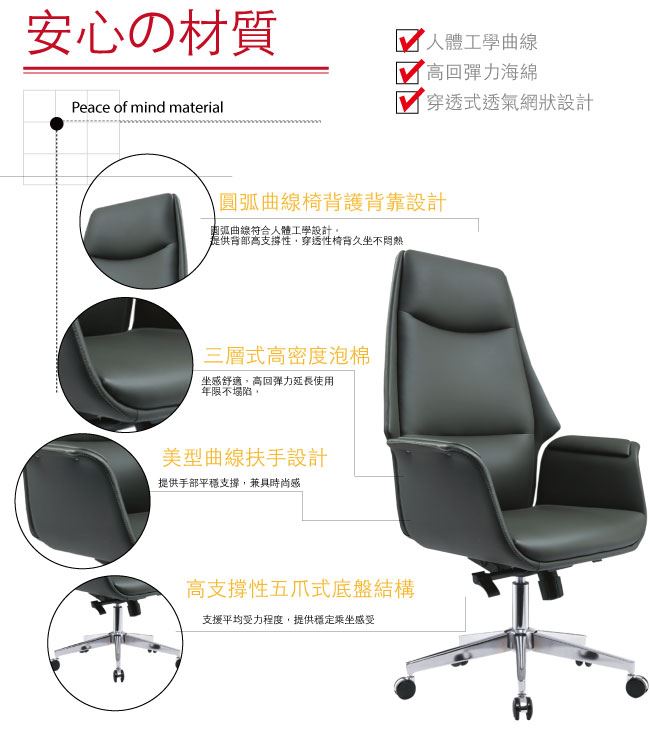 商品介紹 | 【綠家居】丘基 時尚灰皮革多功能辦公椅 材質採用高密度高彈性泡棉+曲木實木材質+環保PU皮革+不鏽鋼五金腳座&靜音PP材質滾輪+SGS認證合格氣壓棒+防爆托盤裝置+高支撐性五爪式底盤結構等安心材質,另備有椅背可調整+椅身高低調整撥桿等機能性設計。產品免組裝+全由專人配送到家,專業安心服務,替你省下更多時間! 【商品特色】 高密度高彈性泡棉+不鏽鋼五金材質椅身安心材質製造 不鏽鋼五金腳座&靜音PP材質滾輪+SGS認證合格氣壓棒安心材質製造 防爆托盤裝置+高支撐性五爪式底盤結構等安心材質製造 另有椅背可調整+椅身高低調整撥桿等機能性設計 此商品不需要自行組裝,專人組裝完成配送到府即可使用 |