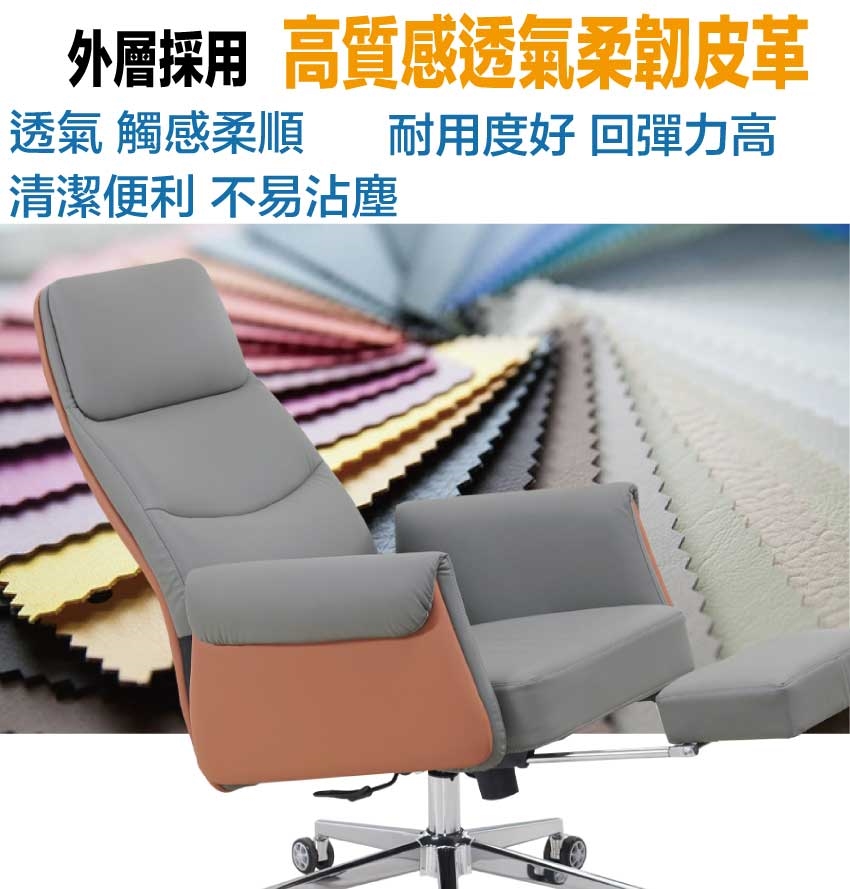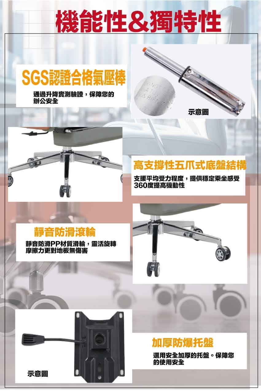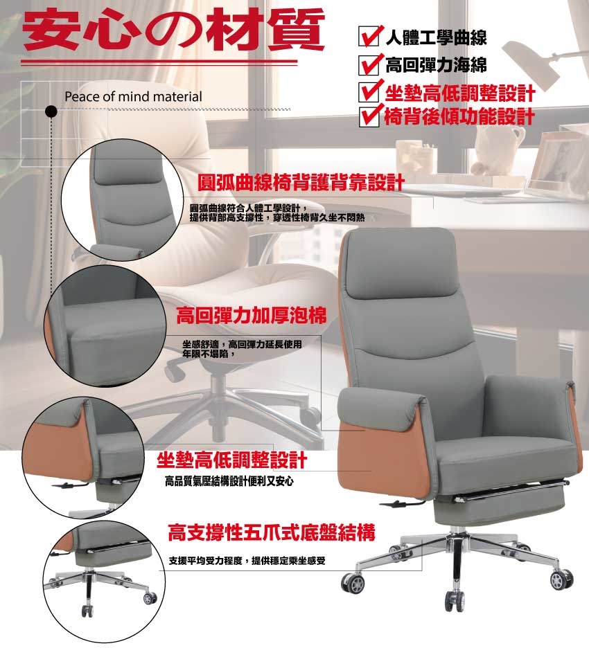 採用防鏽鋼管骨架+不鏽鋼五金結構+五抓式底盤+防爆托盤架+高磅數氣壓棒+靜音防滑滾輪+柔韌透氣皮革+高回彈性加厚泡棉等安心材質製造