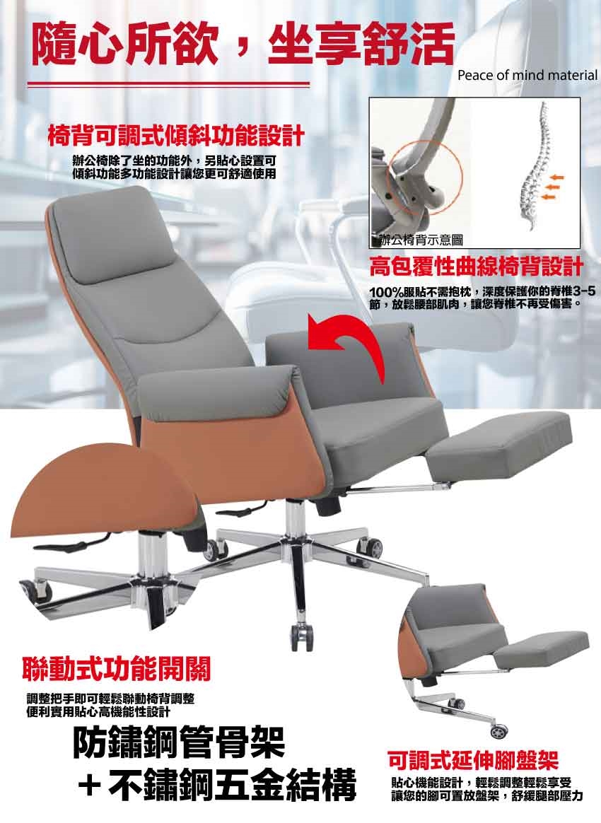 辦公椅搭配採用椅背可後仰&坐墊高度調整+連動式伸縮腳靠枕等機能性設計