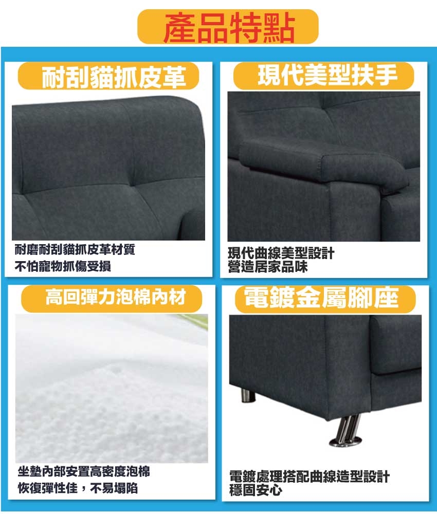 採用內部實木底框+電鍍金屬腳座+耐磨貓抓皮革+高回彈泡棉等安心材質製造