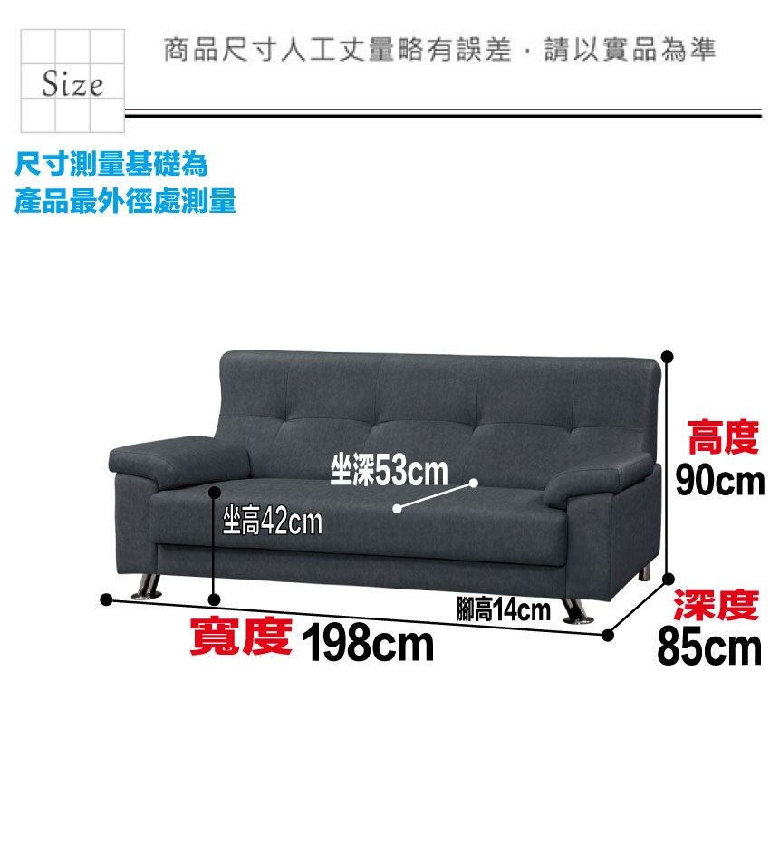 3人沙發椅尺寸:(寬)198x(深)85(高)90/公分
