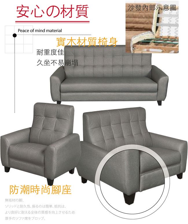 材質 | ◆產品名稱: 【綠家居】拉米堡 現代灰貓抓皮革獨立筒沙發椅組合(1+2+3人座) 產品尺寸: 1人座:(寬)93x(深)82x(高)98/ 公分 2人座:(寬)140x(深)82x(高)98/ 公分 3人座:(寬)195x(深)82x(高)98/ 公分 材質:桐木實木骨架椅身+黑漆防潮腳座 皮革:耐磨貓抓皮革 坐墊:獨立筒彈簧座包+三層式高密度泡棉+絲棉 |