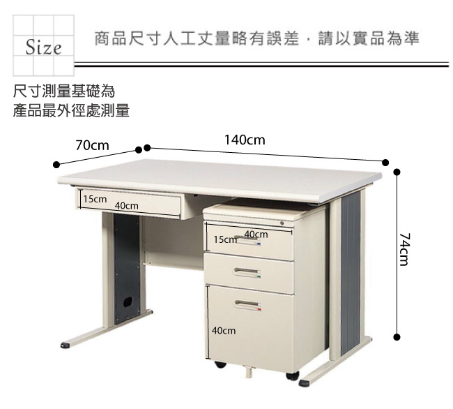 | 【綠家居】莫爾4.6尺辦公桌組合(單抽+活動櫃) 產品尺寸: 辦公桌:(寬)140x (深)70 x(高)74 / 公分 活動櫃:(寬)40x (深)57 x(高)65 / 公分
