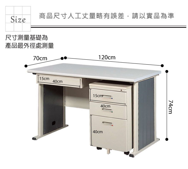 | 【綠家居】莫奇爾4尺辦公桌組合(單抽+活動櫃) 產品尺寸: 辦公桌:(寬)120x (深)70 x(高)74 / 公分 活動櫃:(寬)40x (深)57 x(高)65 / 公分