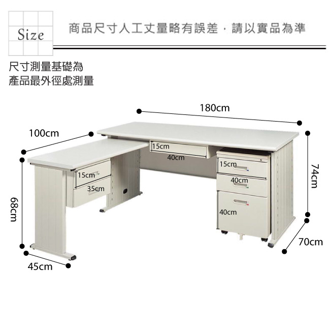 | 【綠家居】普利通L型6尺辦公桌組合(單活動櫃+側桌) 產品尺寸: 組合尺寸:(寬)180x (深)170 x(高)74 / 公分 辦公桌:(寬)180x (深)70 x(高)74 / 公分 活動櫃:(寬)40x (深)57 x(高)65 / 公分 側桌:(寬)100x (深)45 x(高)68 / 公分
