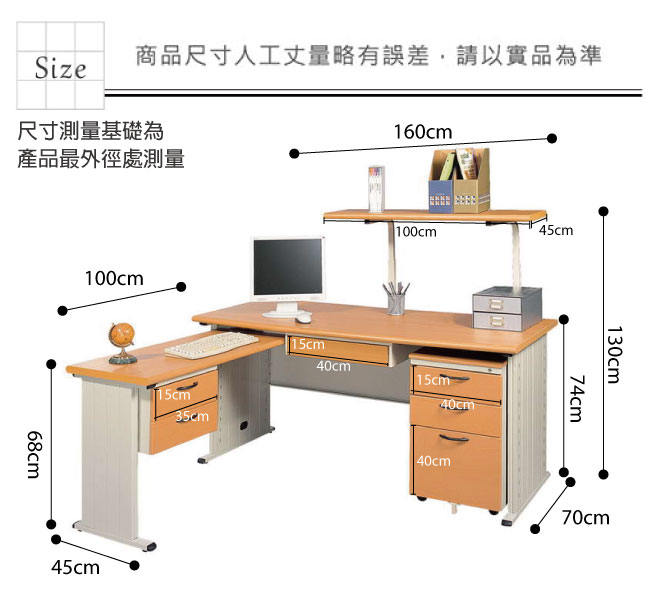 | 【綠家居】普斯利L型5.3尺辦公桌組合(二色可選+單活動櫃+側桌+桌上架) 產品尺寸: 組合尺寸:(寬)160x (深)170 x(高)130 / 公分 辦公桌:(寬)160x (深)70 x(高)74 / 公分 活動櫃:(寬)40x (深)57 x(高)65 / 公分 側桌:(寬)100x (深)45 x(高)68 / 公分 桌上架:(寬)100x (深)45 / 公分