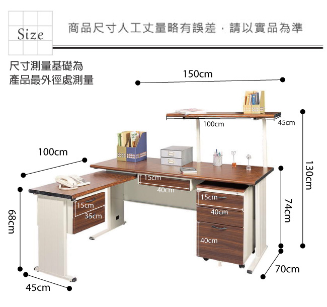 | 【綠家居】安利L型5尺辦公桌組合(二色可選+單活動櫃+側桌+桌上架) 產品尺寸: 組合尺寸:(寬)150x (深)170 x(高)130 / 公分 辦公桌:(寬)150x (深)70 x(高)130 / 公分 活動櫃:(寬)40x (深)57 x(高)65 / 公分 側桌:(寬)100x (深)45 x(高)68 / 公分 桌上架:(寬)100x (深)45 / 公分