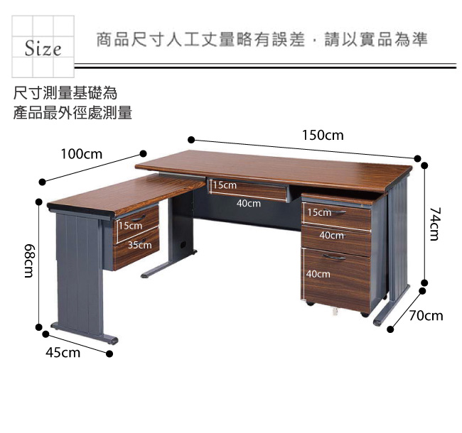 | 【綠家居】索利L型5尺辦公桌組合(二色可選+單活動櫃+側桌) 產品尺寸: 組合尺寸:(寬)150x (深)170 x(高)74 / 公分 辦公桌:(寬)150x (深)70 x(高)74 / 公分 活動櫃:(寬)40x (深)57 x(高)65 / 公分 側桌:(寬)100x (深)45 x(高)68 / 公分