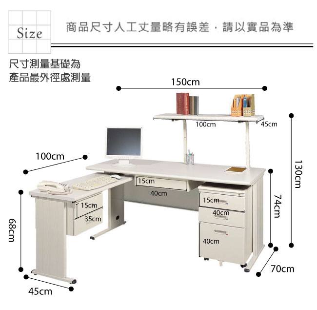 | 【綠家居】培爾L型5尺辦公桌組合(單活動櫃+側桌+桌上架) 產品尺寸: 組合尺寸:(寬)150x (深)170 x(高)130 / 公分 辦公桌:(寬)150x (深)70 x(高)130 / 公分 活動櫃:(寬)40x (深)57 x(高)65 / 公分 側桌:(寬)100x (深)45 x(高)68 / 公分 桌上架:(寬)100x (深)45 / 公分