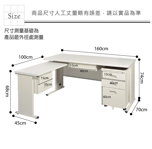 | 【綠家居】培爾L型5.3尺辦公桌組合(單活動櫃+側桌) 產品尺寸: 組合尺寸:(寬)160x (深)170 x(高)74 / 公分 辦公桌:(寬)160x (深)70 x(高)74 / 公分 活動櫃:(寬)40x (深)57 x(高)65 / 公分 側桌:(寬)100x (深)45 x(高)68 / 公分