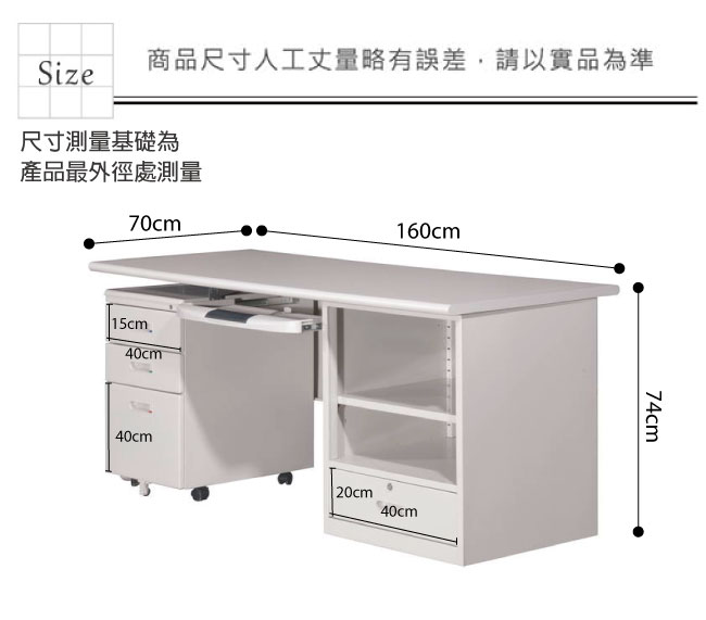 | 【綠家居】培爾5.3尺辦公桌組合(單活動櫃+單抽櫃+不含插座) 產品尺寸: 辦公桌:(寬)160x (深)70 x(高)74 / 公分 活動櫃:(寬)40x (深)57 x(高)65 / 公分
