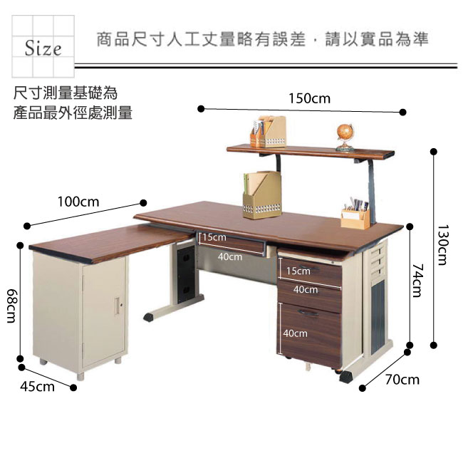 | 【綠家居】艾培L型5尺辦公桌組合(單活動櫃+側桌櫃+桌上架) 產品尺寸: 組合尺寸:(寬)150x (深)170 x(高)130 / 公分 辦公桌:(寬)150x (深)70 x(高)74 / 公分 活動櫃:(寬)40x (深)57 x(高)65 / 公分 側桌:(寬)100x (深)45 x(高)68 / 公分 桌上架:(寬)100x (深)45 x / 公分