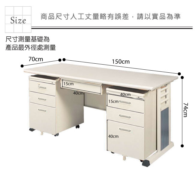 | 【綠家居】艾許5尺辦公桌組合(單抽+活動櫃X2) 產品尺寸: 辦公桌:(寬)150x (深)70 x(高)74 / 公分 活動櫃:(寬)40x (深)57 x(高)65 / 公分