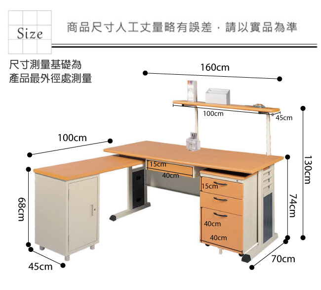 | 【綠家居】泰爾L型5.3尺辦公桌組合(單活動櫃+側桌櫃+桌上架) 產品尺寸: 組合尺寸:(寬)160x (深)170 x(高)130 / 公分 辦公桌:(寬)160x (深)70 x(高)74 / 公分 活動櫃:(寬)40x (深)57 x(高)65 / 公分 側桌:(寬)100x (深)45 x(高)68 / 公分 桌上架:(寬)100x (深)45 / 公分