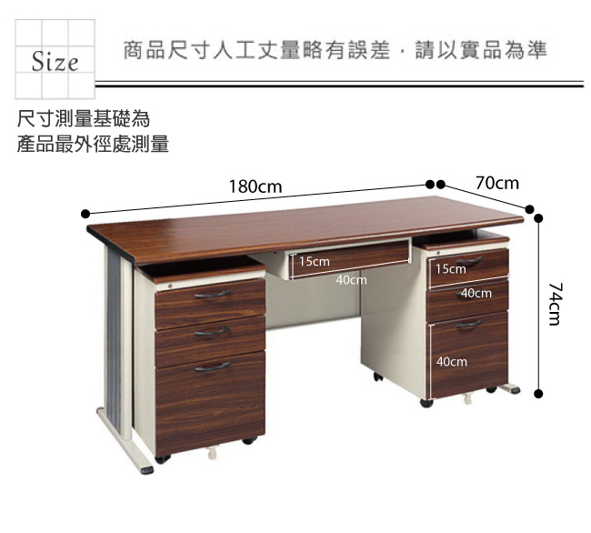 | 【綠家居】舒爾6尺辦公桌組合(二色可選+單抽+活動櫃X2) 產品尺寸: 辦公桌:(寬)180x (深)70 x(高)74 / 公分 活動櫃:(寬)40x (深)57 x(高)65 / 公分
