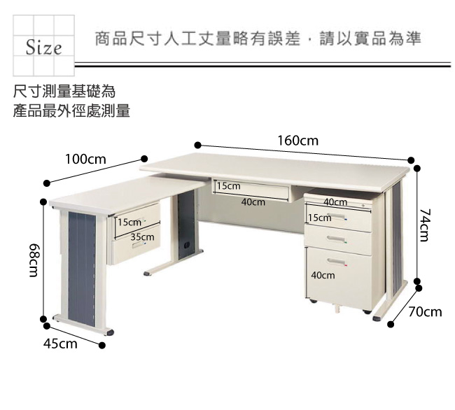| 【綠家居】莫爾L型5.3尺辦公桌組合(單活動櫃+側桌) 產品尺寸: 組合尺寸:(寬)160x (深)170 x(高)74 / 公分 辦公桌:(寬)160x (深)70 x(高)74 / 公分 活動櫃:(寬)40x (深)57 x(高)65 / 公分 側桌:(寬)100x (深)45 x(高)68 / 公分