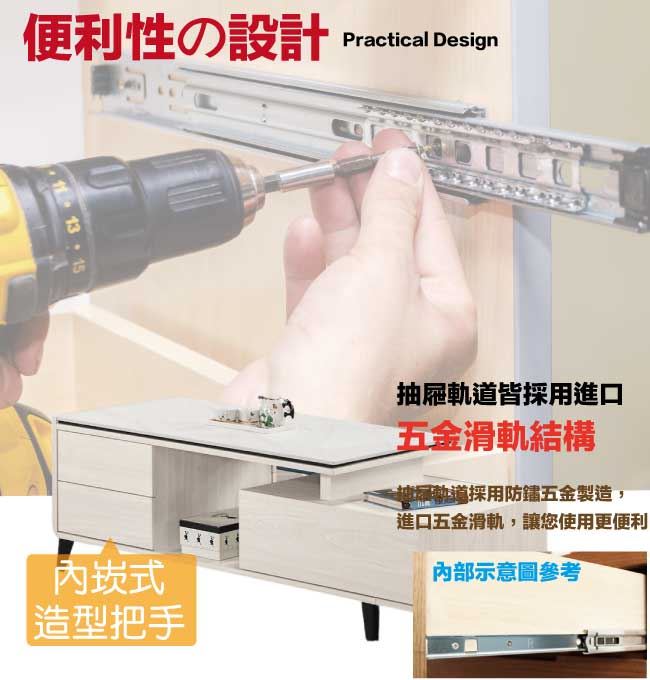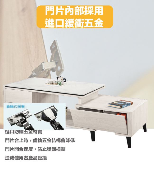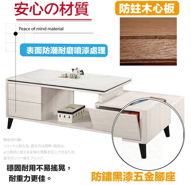 商 品 介 紹 | 【綠家居】卡蘿莉4尺岩板可伸縮機能性大茶几 淺橡木紋色系+現代簡約風格+安心材質製造,整體採用防蛀木心板+防鏽黑漆五金腳座+五金滑軌結構+12mm高硬度岩板等安心材質製造,產品外層採用防潮耐磨噴漆處理搭配採用雙面開合開門櫃+四抽屜+桌面可伸縮移動(120-150cm)+開放式收納等收納空間設計,全由專人配送到家,專業安心服務,替你省下更多時間! 【商品特色】 淺橡木紋色系+現代簡約風格+安心材質製造,使用放心+搭配居家更便利 採用防蛀木心板+防鏽黑漆五金腳座+五金滑軌結構+12mm高硬度岩板等安心材質製造 產品外層採用防潮耐磨噴漆處理 搭配採用雙面開合開門櫃+四抽屜+桌面可伸縮移動(120-150cm)+開放式收納等收納空間設計 此商品不需要DIY組立,此商品為組立後之成品 品質保證、專業設計、貼心服務 全由專人配送到家,專業安心服務,替您省下更多時間