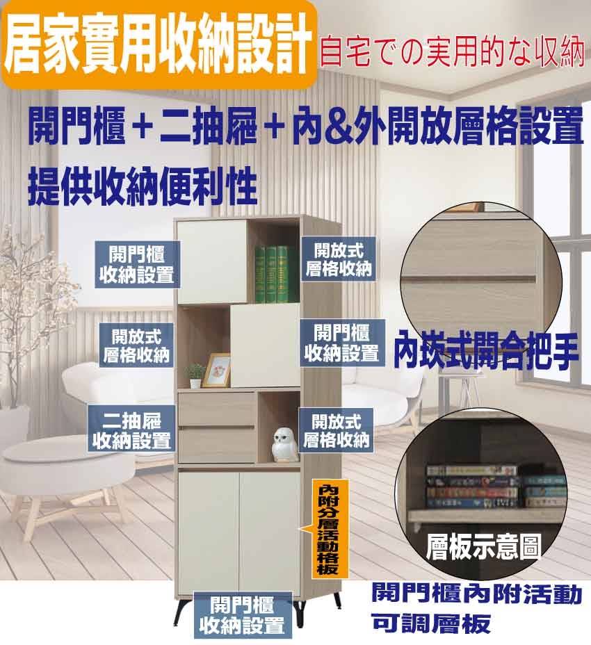 採用開門櫃+二抽屜+內&外開放層格等收納空間設計
