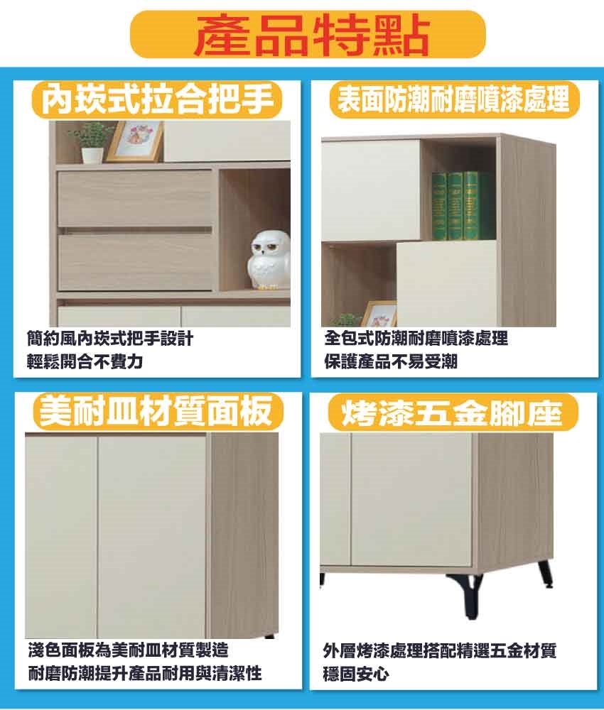 材質:防蛀木心板+烤漆金屬腳座+防夾手緩衝門片五金