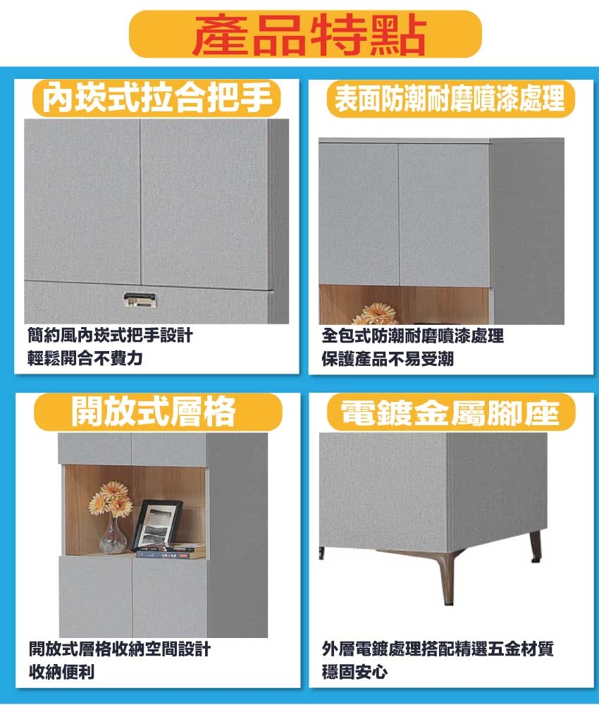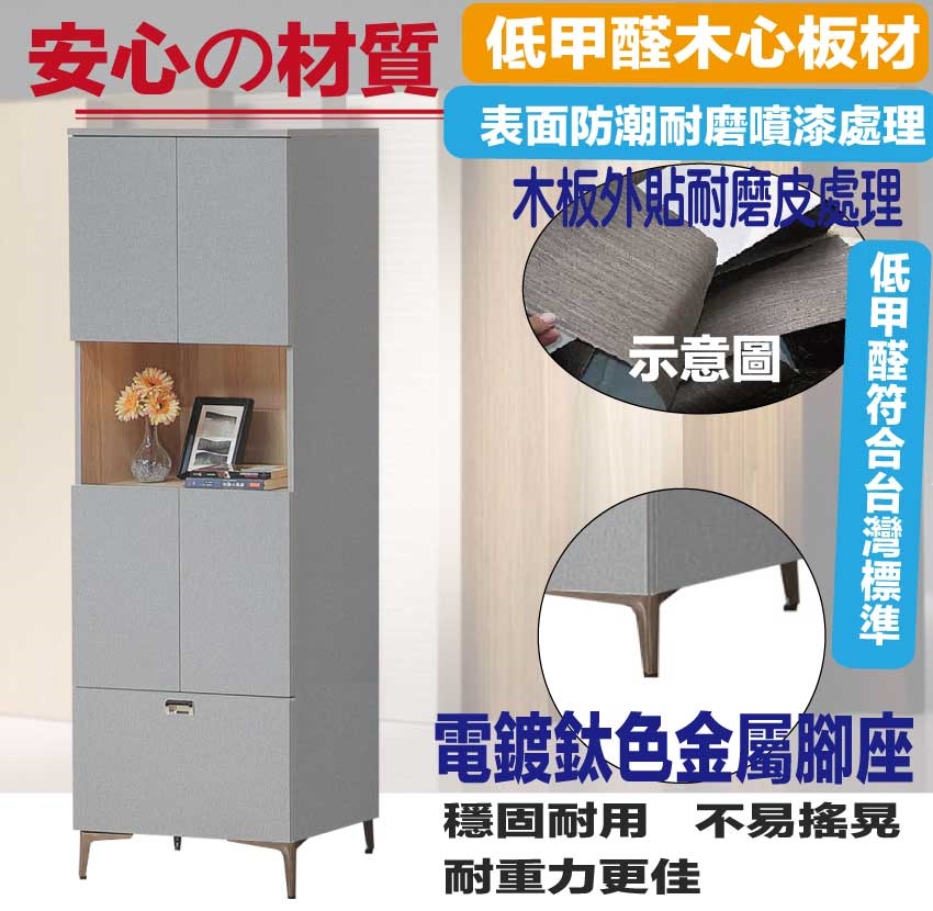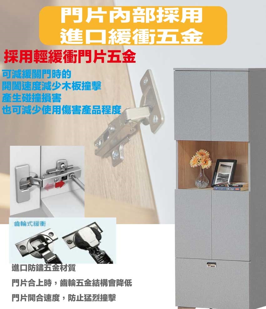材質:防蛀木心板+電鍍金屬腳座+防夾手緩衝門片五金