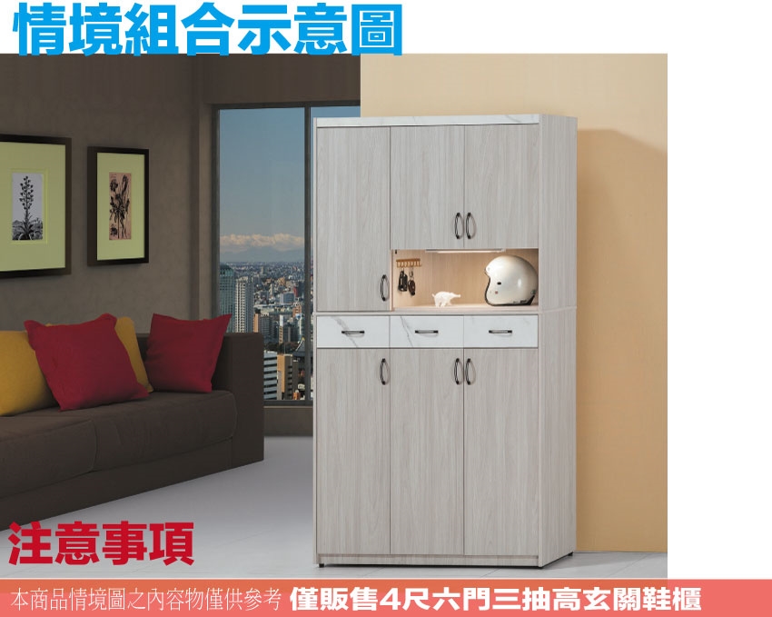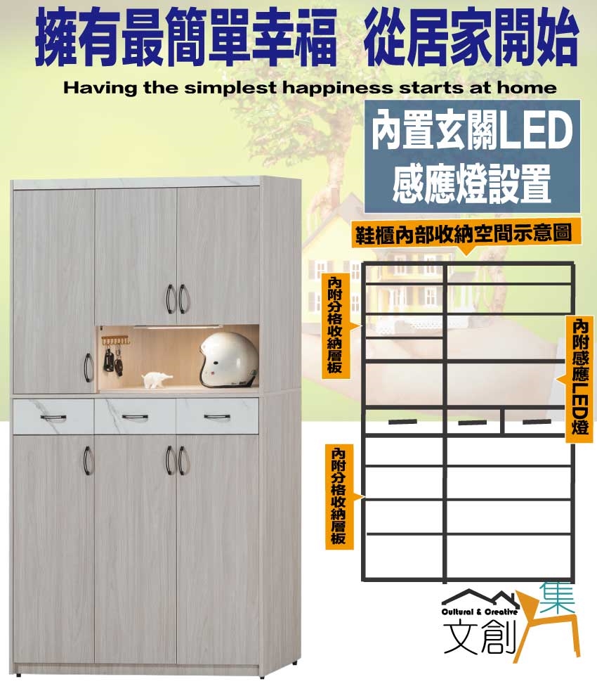 - ◆產品名稱:【綠家居】皮登4尺六門三抽感應燈高鞋櫃(仿大理石紋路耐磨美耐皿面板)