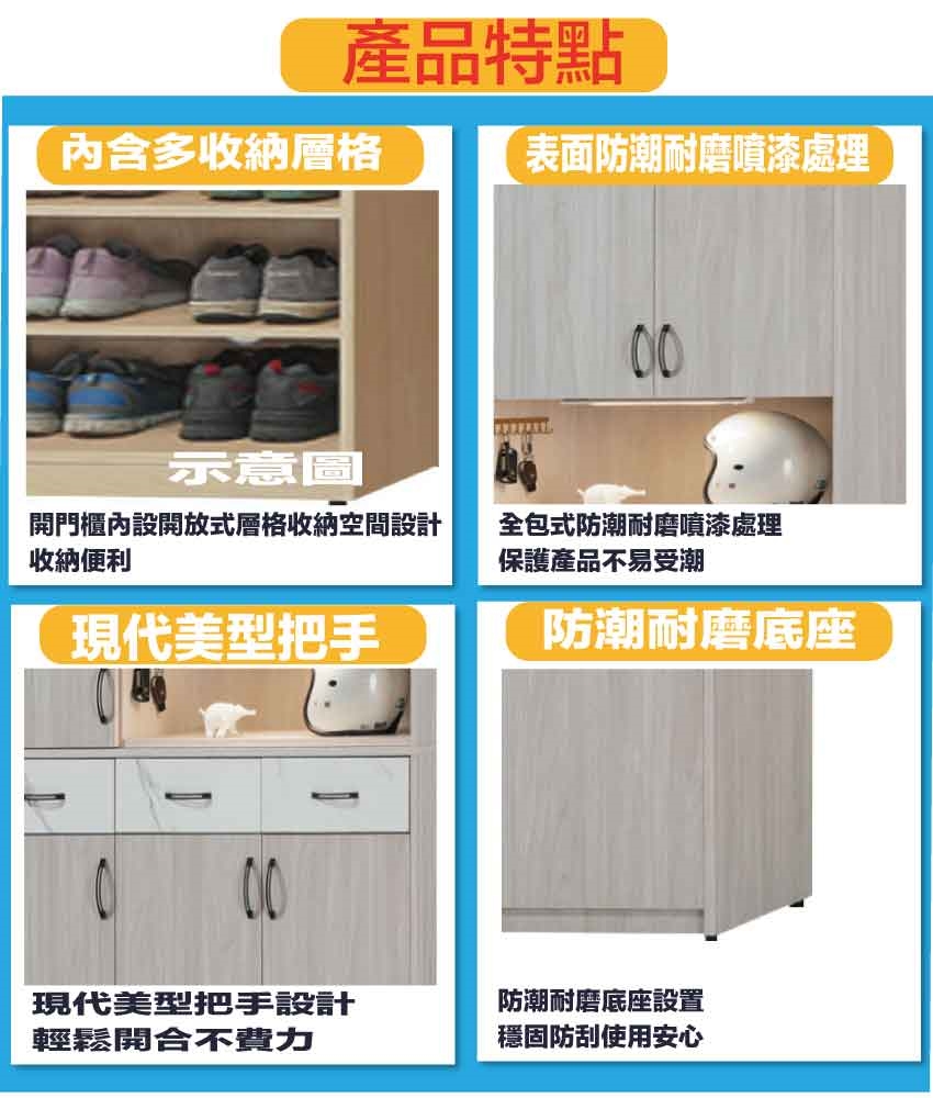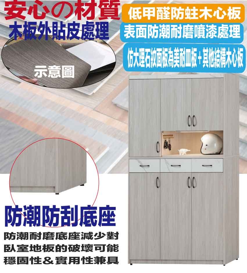 材質:防蛀木心板+防潮耐磨底座(可調高低水平)+仿大理石紋路耐磨美耐皿面板+防夾手緩衝門片五金 -