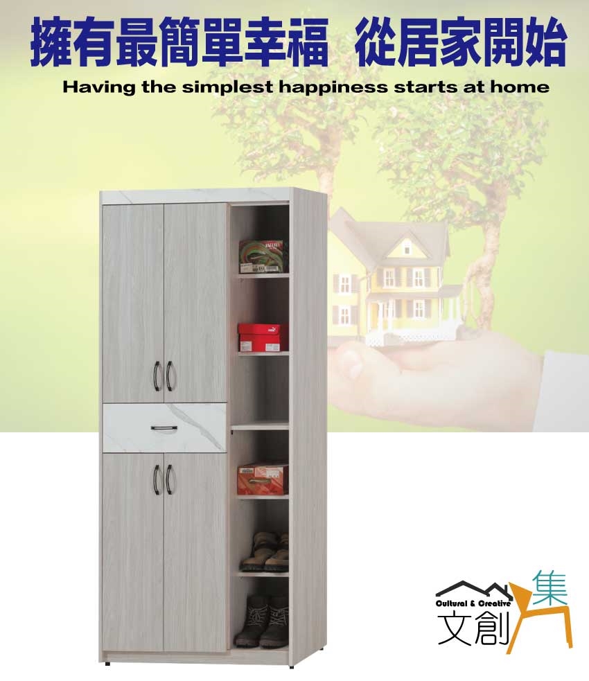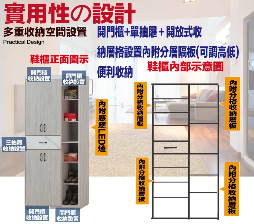 採用開門櫃+單抽屜+內&外開放層格等收納空間設計