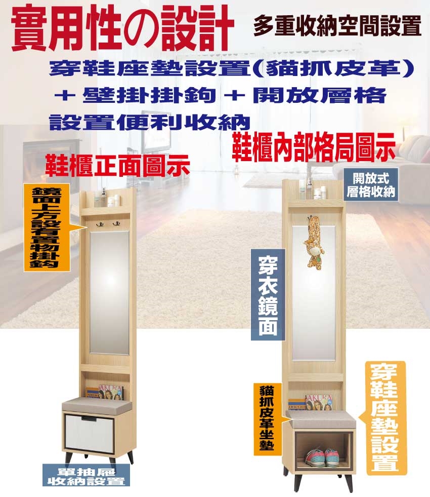 採用單抽格+穿鞋坐墊+穿衣鏡面等收納空間設計