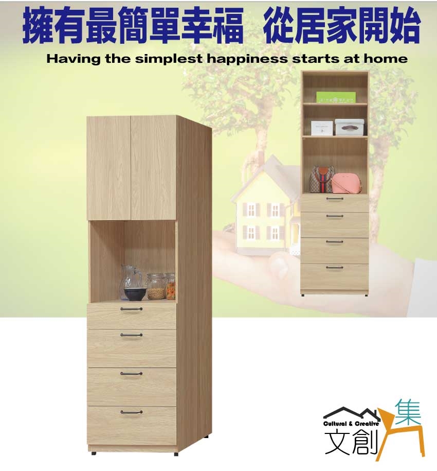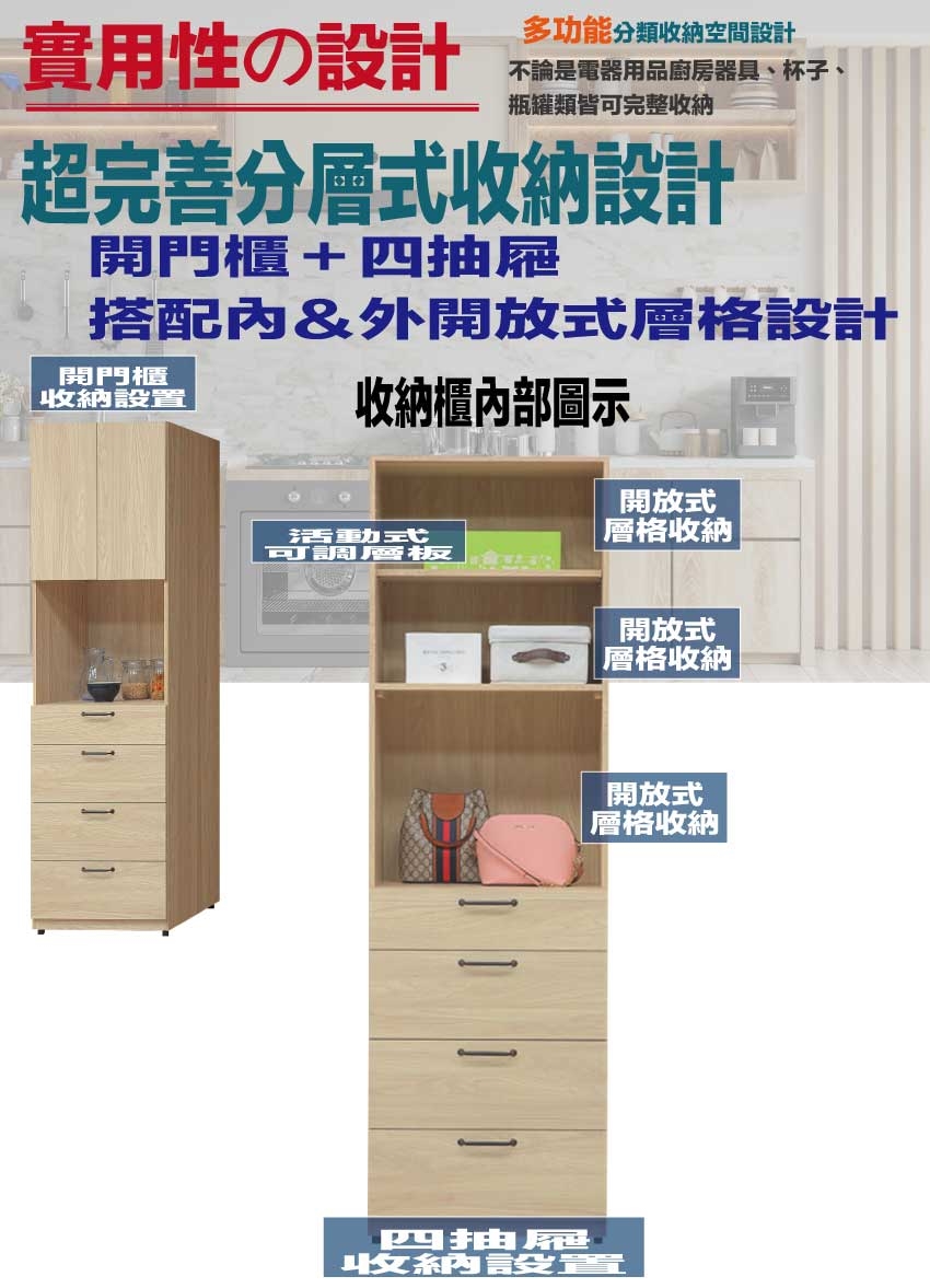 採用開門櫃+四抽屜+內&外開放層格等收納空間設計