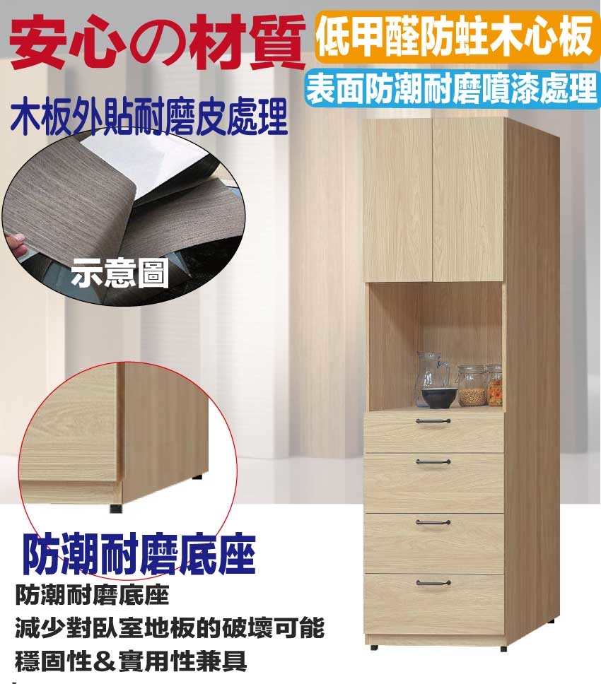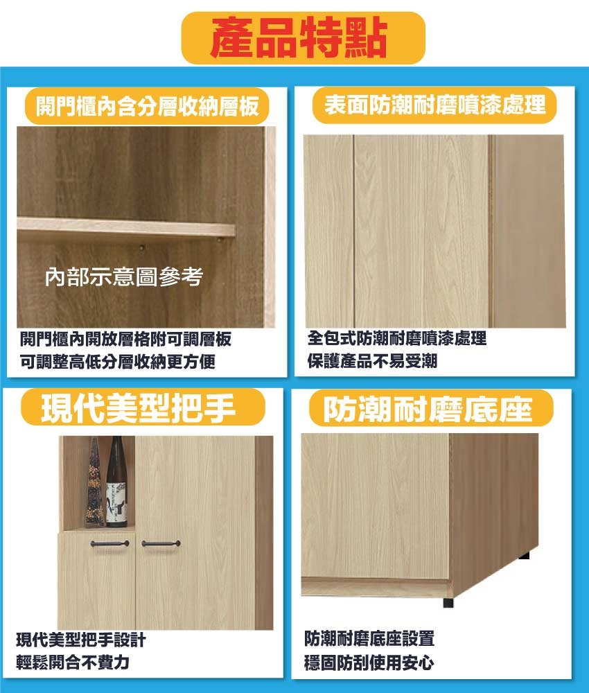 材質:防蛀木心板+防潮耐磨底座(可調高低水平)+防夾手緩衝門片五金 -