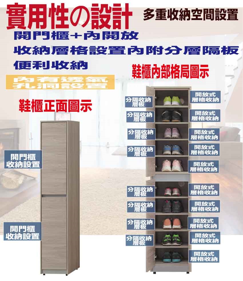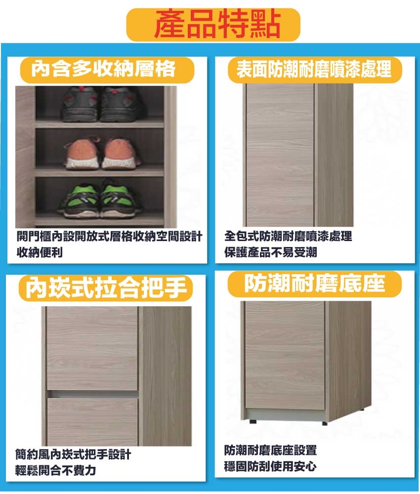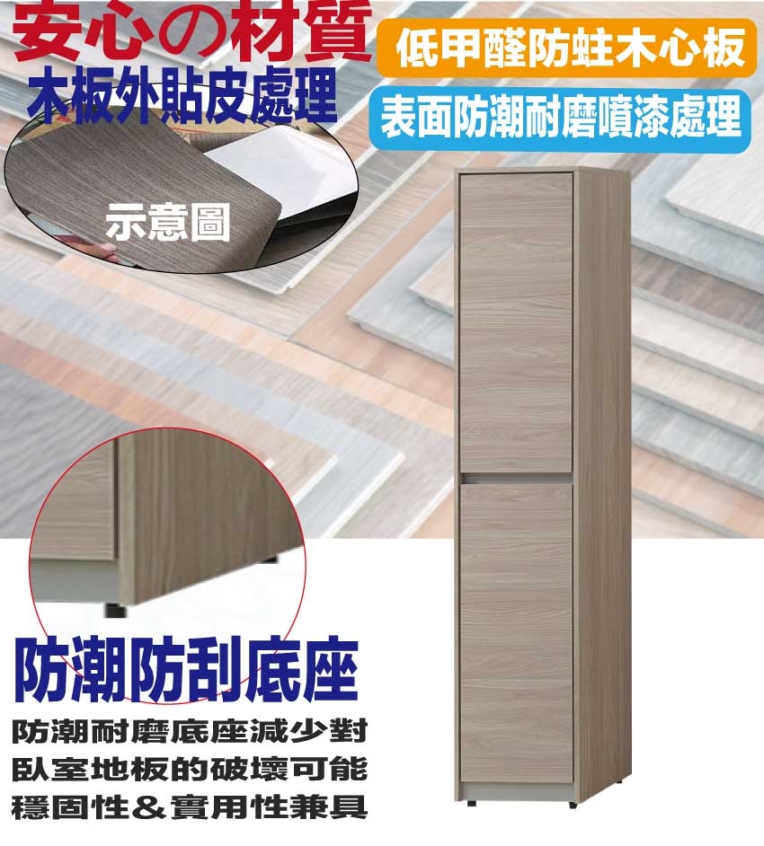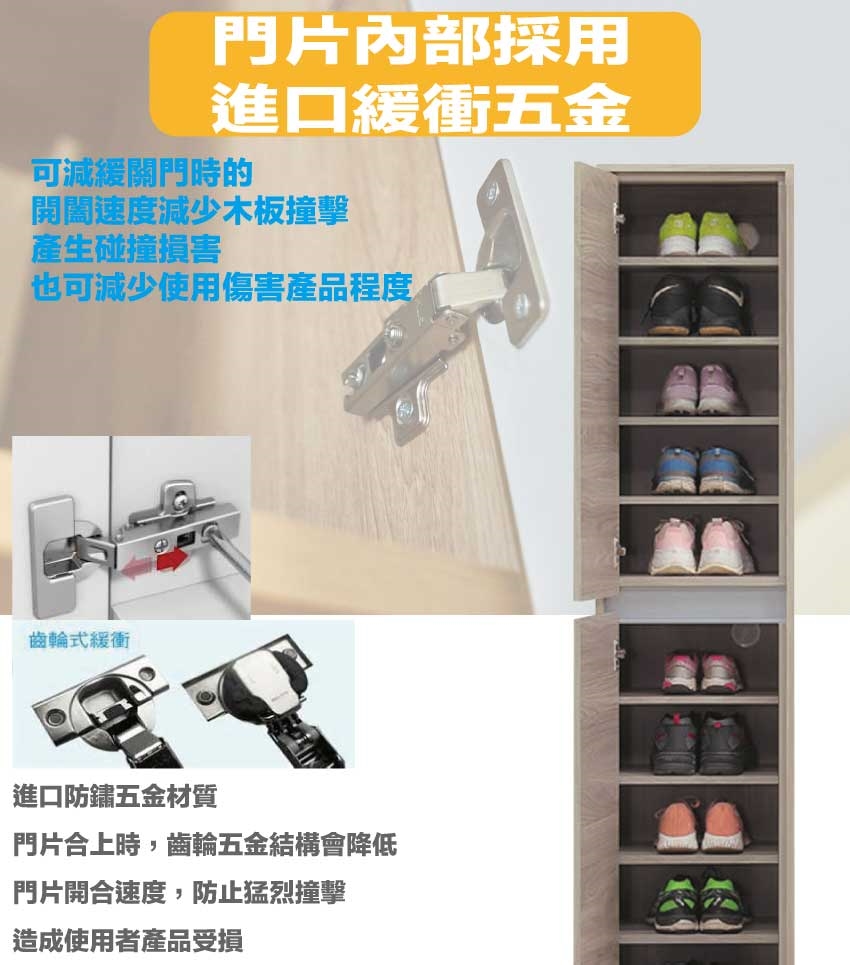 材質:防蛀木心板+防潮耐磨底座(可調高低水平)+防夾手緩衝門片五金 -