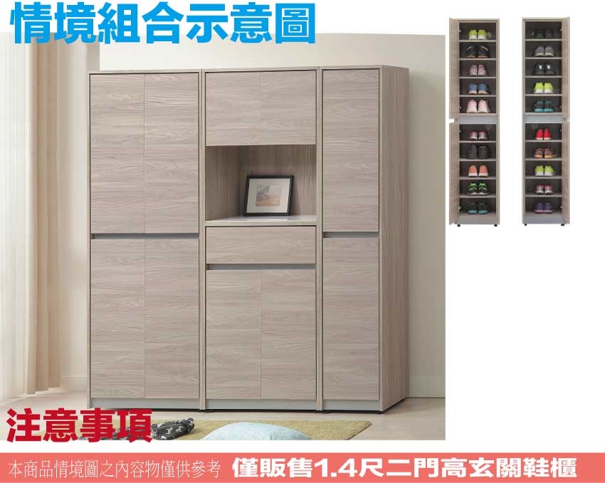 ★偏遠地區需額外加收運費,下標請先問與答詢問★ ★下訂前注意 由於商品流動較快,下訂前請先詢問是否有貨在下訂喔~★ 【綠家居】羅克1.4尺二門高鞋櫃(左&右二向開門方向可選) 淺灰橡木紋色系+現代簡約風格+安心材質製造,使用放心+搭配居家更便利,整體採用防蛀木心板+防潮耐磨底座(可調高低水平)等安心材質製造搭配外層採用防潮耐磨噴漆處理 ,採用開門櫃+內開放層格等收納空間設計,全由專人配送到家,專業安心服務,替你省下更多時間!