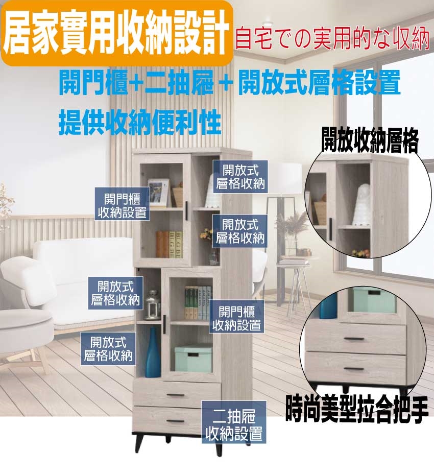 採用開門櫃+二抽屜+內&外開放層格等收納空間設計