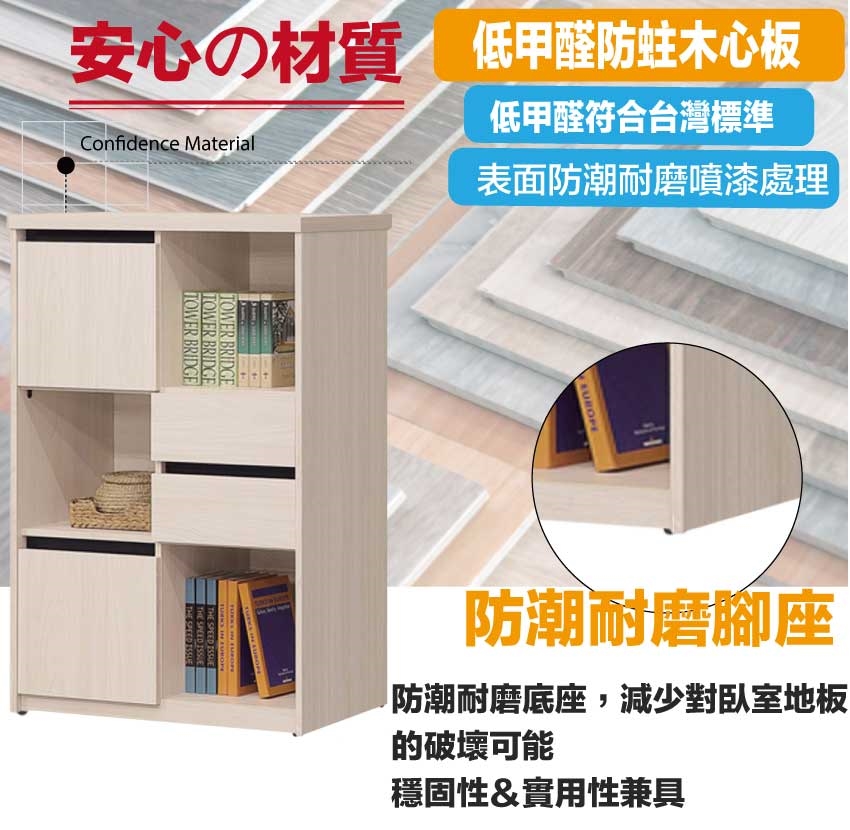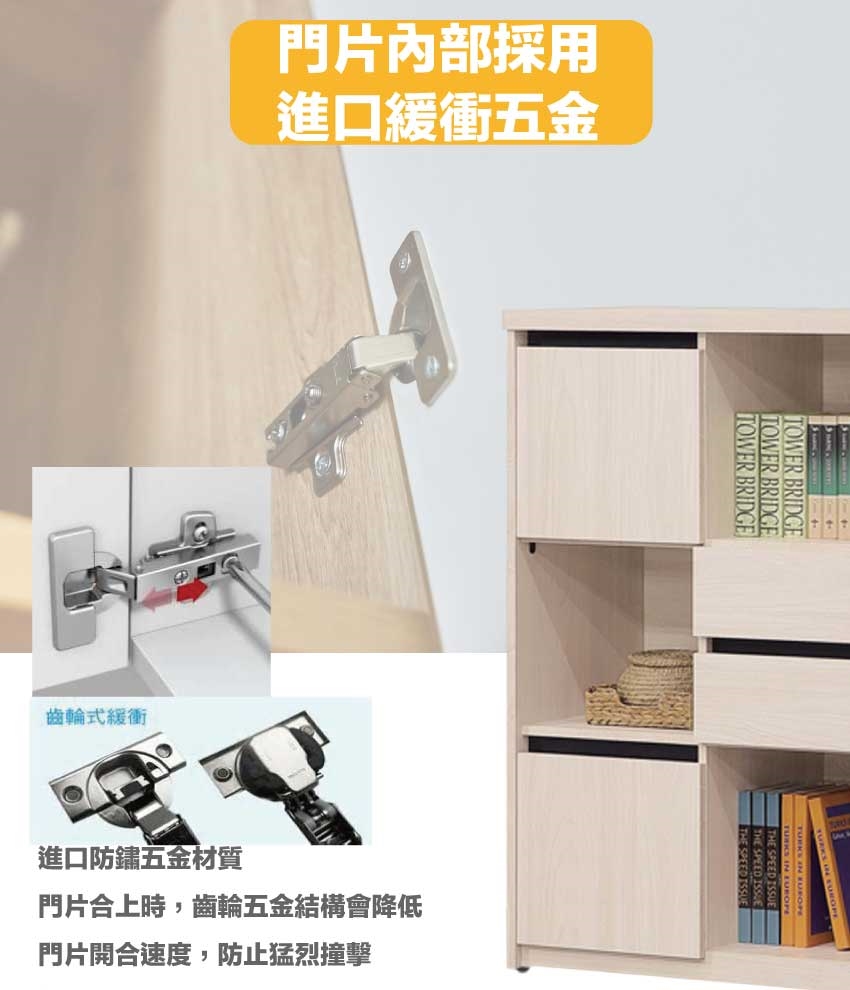 材質:防蛀木心板+防潮耐磨底座(可調高低水平)+防夾手緩衝門片五金