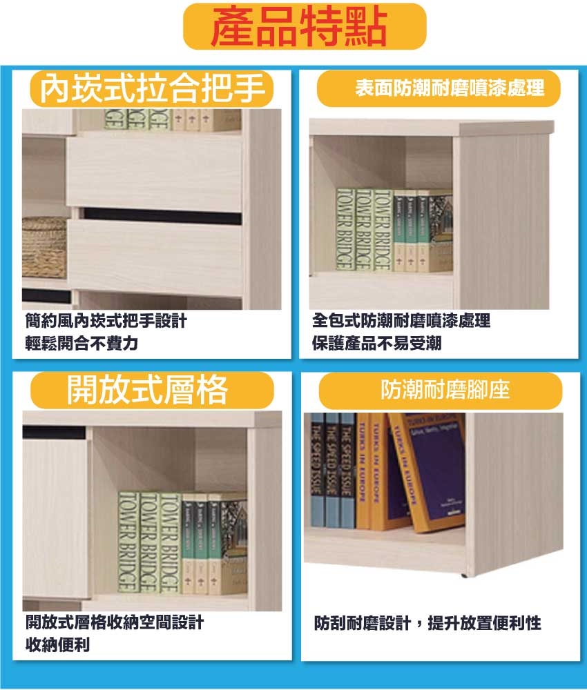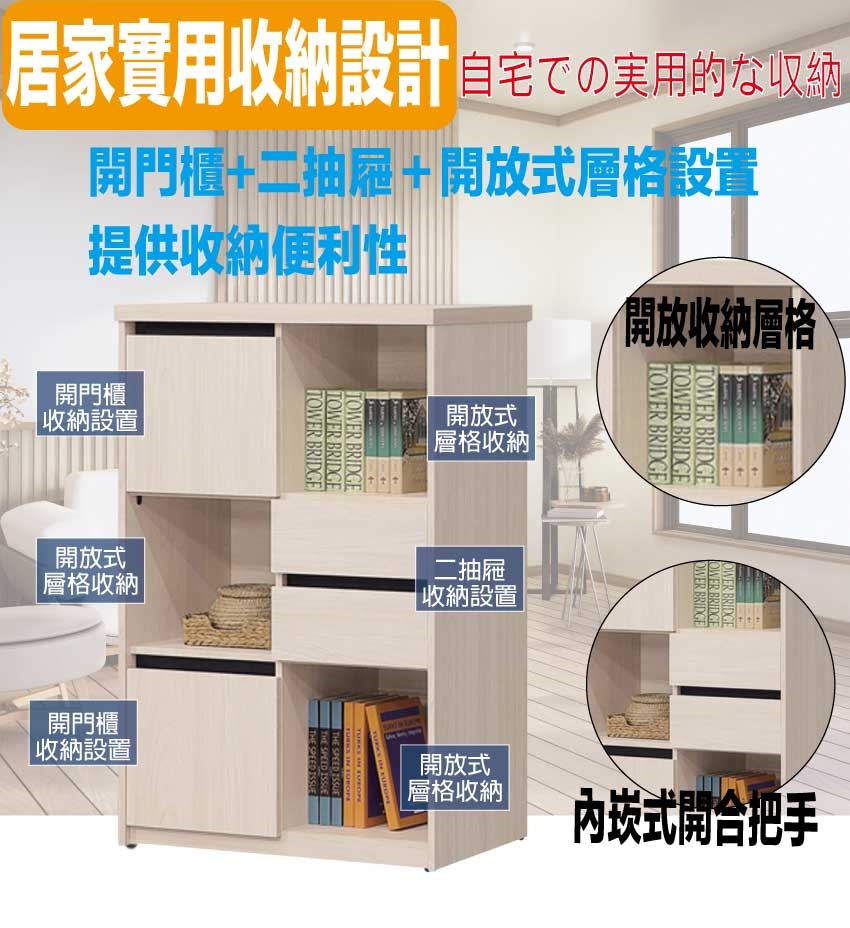採用開門櫃+二抽屜+內&外開放層格等收納空間設計