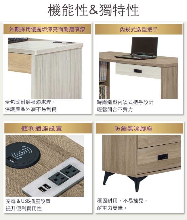 商品介紹 | 【綠家居】甘托克 現代4尺三抽多功能書桌/電腦桌(二色可選) 二色可選+現代簡約風格+安心材質製造,整體採用防蛀木心板+黑鐵砂框架&腳座+五金滑軌結構等安心材質製造,外層採用優利坦全包式耐磨噴漆搭配便利插座設置+三抽屜+開放式收納+自由變化組合等空間設計,全由專人配送到家,專業安心服務,替你省下更多時間! 【商品特色】 二色可選+現代簡約風格+安心材質製造,使用放心+搭配居家更便利 採用防蛀木心板+黑鐵砂腳座+五金滑軌結構等安心材質製造 採用便利插座設置+三抽屜+開放式收納+自由變化組合等空間設計 此商品不需要DIY組立,此商品為組立後之成品 品質保證、專業設計、貼心服務 全由專人配送到家,專業安心服務,替您省下更多時間 |