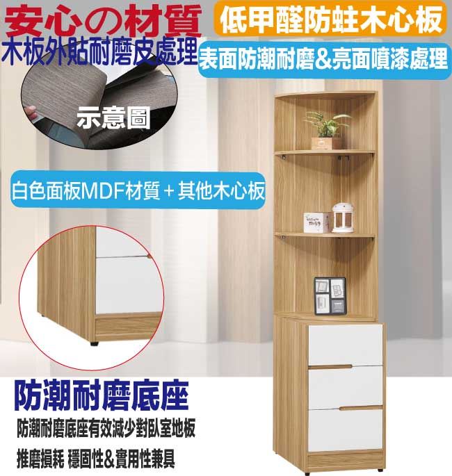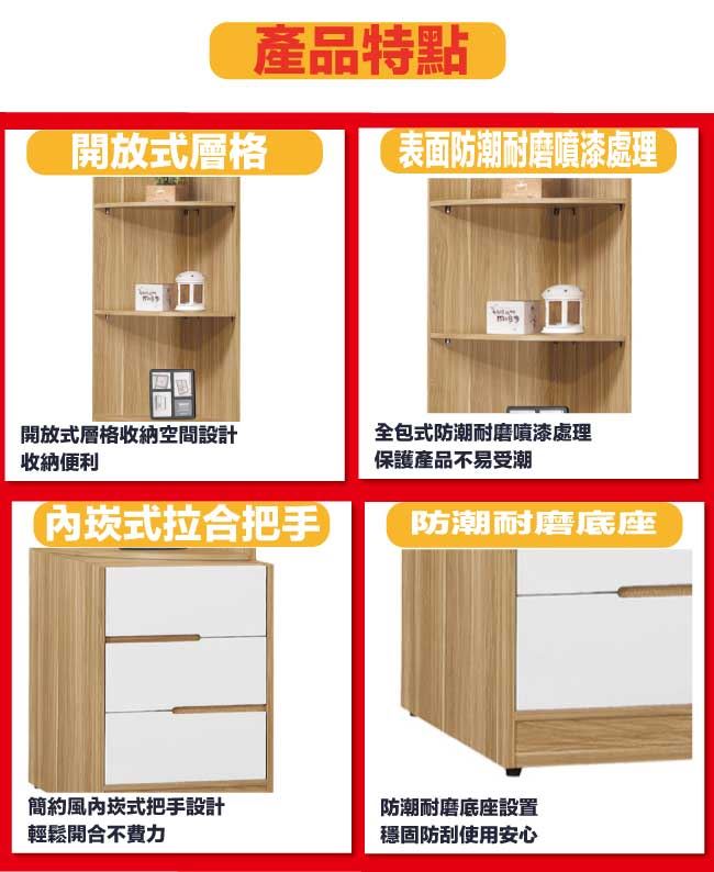 商 品 介 紹 | 【綠家居】約書亞雙色1.5尺三抽側邊櫃 木紋雙色系+現代簡約風格+安心材質製造,使用放心+搭配居家更便利,整體採用防蛀木心板+防潮MDF板材+防潮耐磨底座+五金滑軌結構等安心材質製造搭配外層採用防潮耐磨&亮面噴漆處理 ,採用三抽屜+開放式收納等收納空間設計,全由專人配送到家,專業安心服務,替你省下更多時間! 【商品特色】 木紋雙色系+現代簡約風格+安心材質製造,使用放心+搭配居家更便利 防蛀木心板+防潮MDF板材+防潮耐磨底座+五金滑軌結構等安心材質製造 採用三抽屜+開放式收納等收納空間設計 此商品不需要DIY組立,此商品為組立後之成品 品質保證、專業設計、貼心服務 全由專人配送到家,專業安心服務,替您省下更多時間