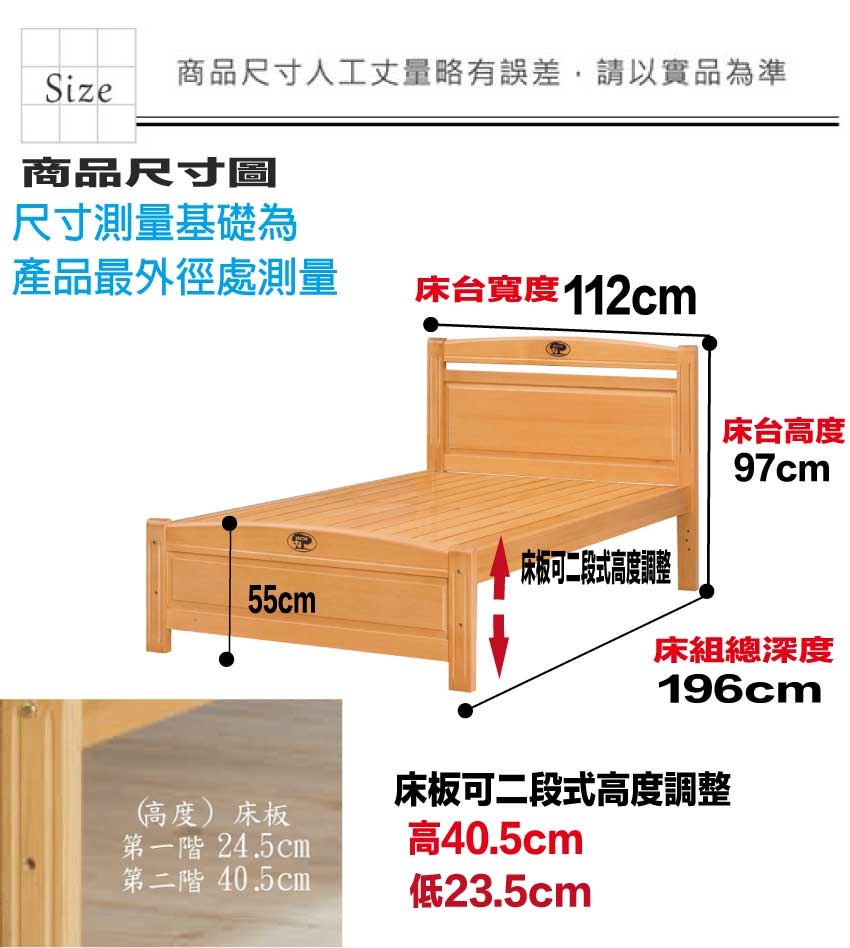 - ◆產品名稱:【綠家居】福順3.5尺單人實木床台(採用實木床底板+床底板二段高度可調)