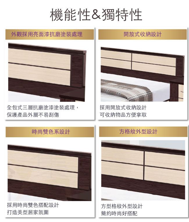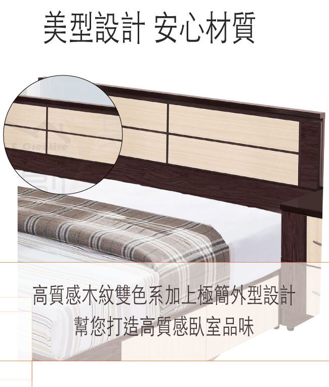 商品介紹 | 【綠家居】 杜亞 環保5尺雙人南亞塑鋼床頭片(不含床底&床墊) 產品採用第一品牌-台製南亞塑鋼舒美板材質,整體材質採用防水+防燃+無甲醛安心塑鋼材質製造 ,防止受潮,增加支撐力,堅固不會塌陷,全由專人配送到家,專業安心服務,替你省下更多時間! 【商品特色】 時尚雙色系設計+安心材質製造,使用放心+搭配居家更便利 防水+防燃+無甲醛安心塑鋼材質,結構牢固耐用,也不用擔心蟲蛀的煩惱,使用放心 產品採用第一品牌-台製南亞塑鋼舒美板材質 此商品不需要DIY組立,此商品為組立後之成品 品質保證、專業設計、貼心服務 全由專人配送到家,專業安心服務,替你省下更多時間 請注意:本公司所販售南亞塑鋼產品為保障消費者權益及維護產品品質的考量,產品皆為接單後生產組裝(配送產品為已組裝完成之半成品),等待週期約10-14天工作天(不含實際配送日期等待天數),請您訂購前務必事先確認是否可以等待,避免引發不必要之消費爭議 ,如有不便之處請見諒! 請注意:本產品因接單後需提前組裝才出貨,外包裝並非裝箱處理,而是採用膠膜作為外包裝保護使用,產品本公司保證皆為全新產品,並非二手產品出貨,另外因塑鋼板材為亮面漆塗裝處理,板材本就容易受粉塵及搬運過程造成輕微刮傷,絕不會影響產品安全結構。 其中以胡桃色系產品因色彩互相對比關係,周邊如有輕微刮傷較稍微明顯,收到產品後如有週邊輕微小刮傷,在不影響產品正面外觀與美觀下,請多包涵並體諒能不吹毛求疵!我們也會做好相關售後服務!謝謝!