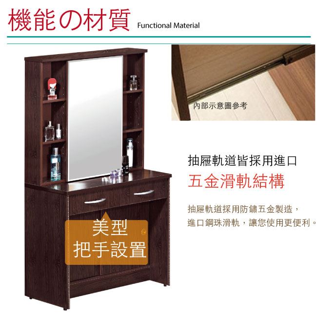 商品介紹 | 【綠家居】多莉 環保2.9尺南亞塑鋼化妝台(不含化妝椅) 產品採用第一品牌-台製南亞塑鋼舒美板+五金滑軌結構+強化玻璃鏡面等材質,整體材質採用防水+防燃+無甲醛安心塑鋼材質製造 ,搭配開合式鏡面櫃+推門櫃+二抽屜+開放式收納等便利設計,防止受潮,增加支撐力,堅固不會塌陷,全由專人配送到家,專業安心服務,替你省下更多時間! 【商品特色】 時尚雙色系設計+安心材質製造,使用放心+搭配居家更便利 搭配開合式鏡面櫃+推門櫃+二抽屜+開放式收納等便利設計 防水+防燃+無甲醛安心塑鋼材質,結構牢固耐用,也不用擔心蟲蛀的煩惱,使用放心 產品採用第一品牌-台製南亞塑鋼舒美板材質 此商品不需要DIY組立,此商品為組立後之成品 品質保證、專業設計、貼心服務 全由專人配送到家,專業安心服務,替你省下更多時間 請注意:本公司所販售南亞塑鋼產品為保障消費者權益及維護產品品質的考量,產品皆為接單後生產組裝(配送產品為已組裝完成之半成品),等待週期約10-14天工作天(不含實際配送日期等待天數),請您訂購前務必事先確認是否可以等待,避免引發不必要之消費爭議 ,如有不便之處請見諒! 請注意:本產品因接單後需提前組裝才出貨,外包裝並非裝箱處理,而是採用膠膜作為外包裝保護使用,產品本公司保證皆為全新產品,並非二手產品出貨,另外因塑鋼板材為亮面漆塗裝處理,板材本就容易受粉塵及搬運過程造成輕微刮傷,絕不會影響產品安全結構。 其中以胡桃色系產品因色彩互相對比關係,周邊如有輕微刮傷較稍微明顯,收到產品後如有週邊輕微小刮傷,在不影響產品正面外觀與美觀下,請多包涵並體諒能不吹毛求疵!我們也會做好相關售後服務!謝謝! |