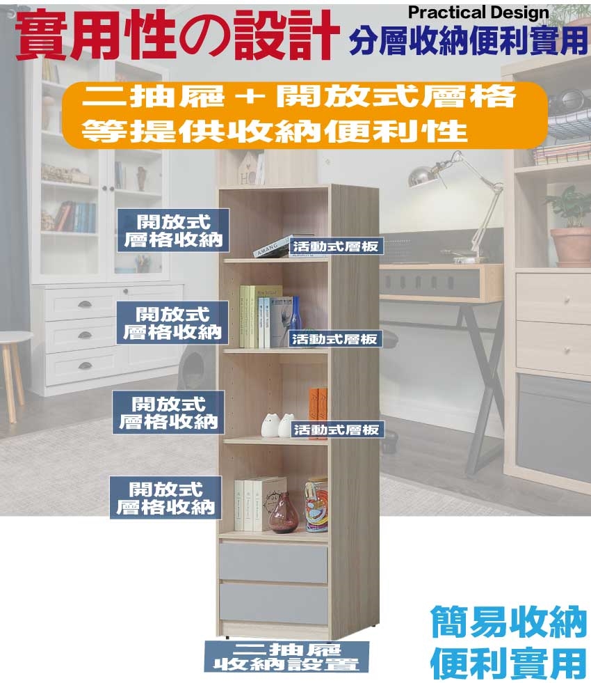 搭配採用二抽屜+開放層格等收納空間設計