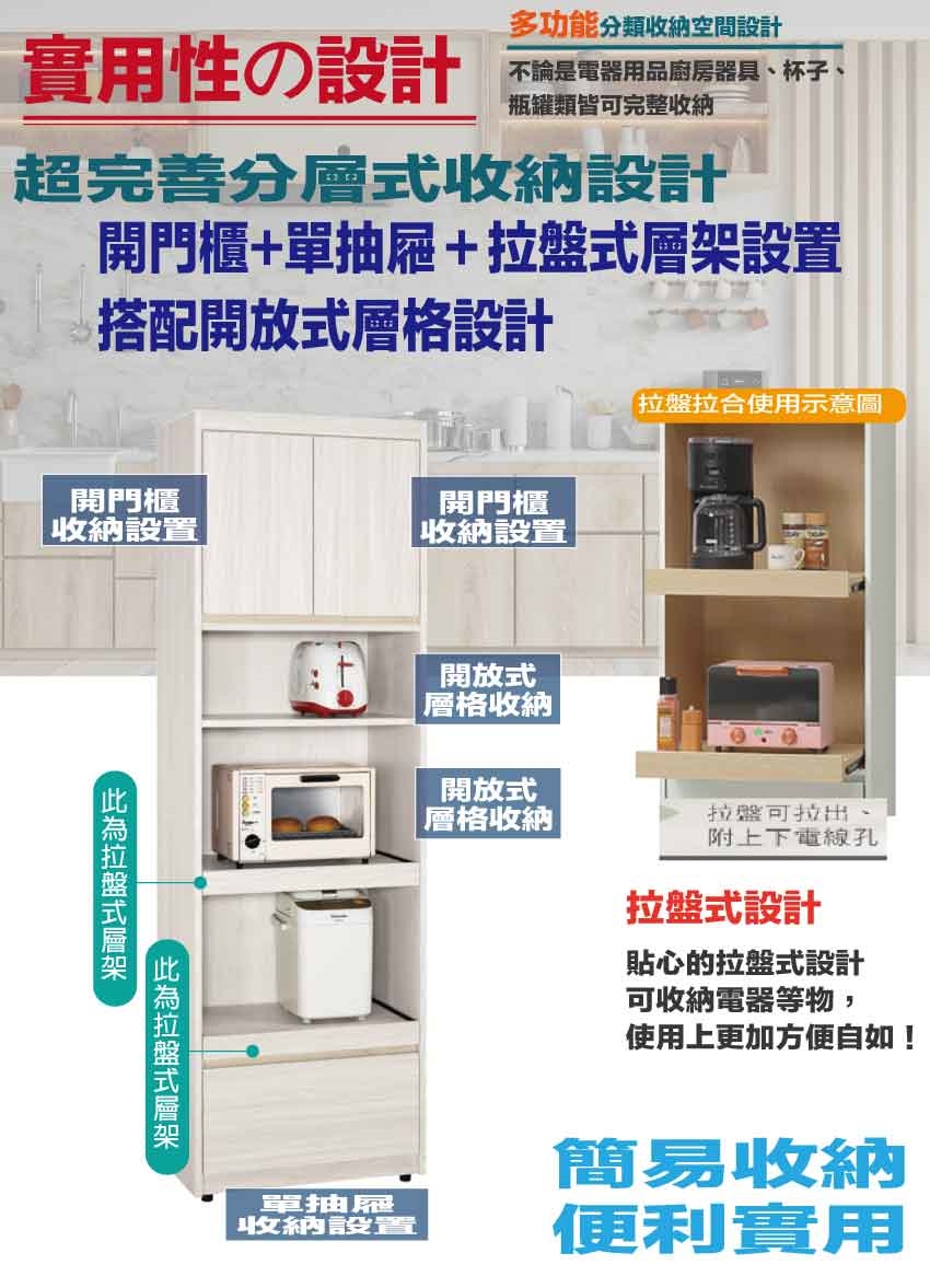 搭配採用開門櫃+拉盤收納層架+單抽屜+內&外開放層格等收納空間設計