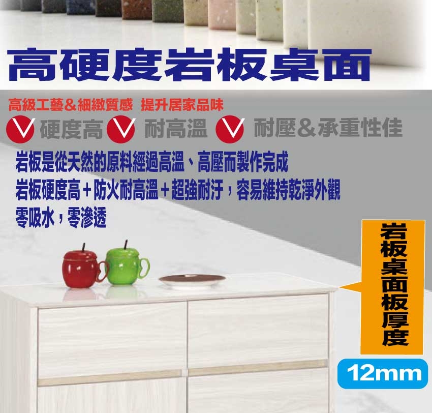 採用防蛀木心板+防潮耐磨底座+防夾手緩衝門片五金+12mm高硬度岩板桌面板+五金滑軌結構等安心材質製造
