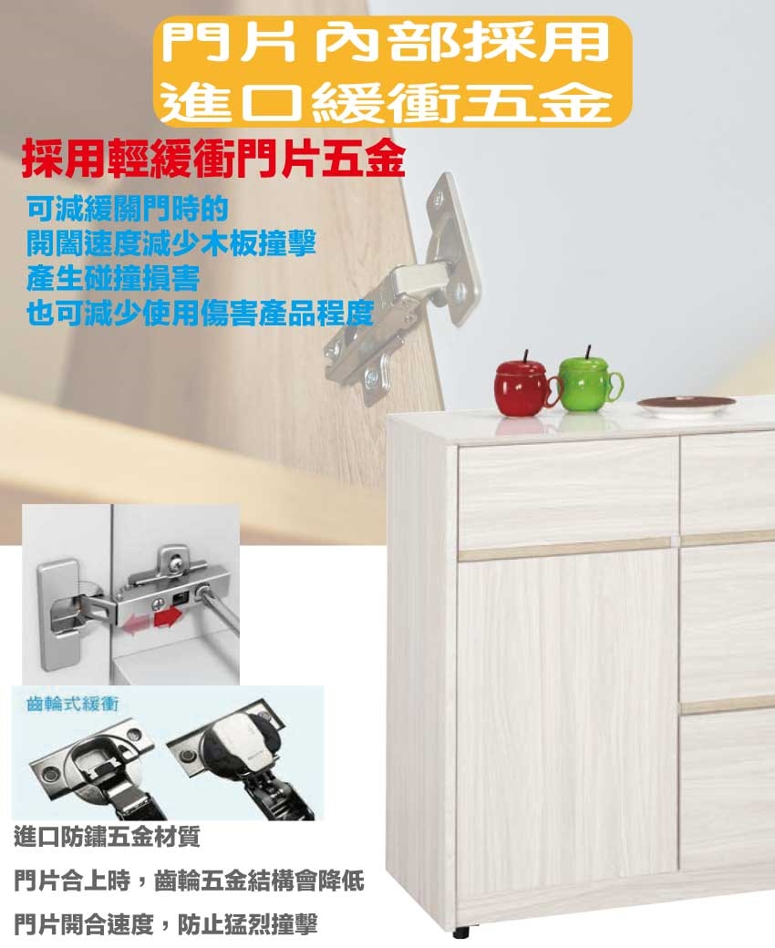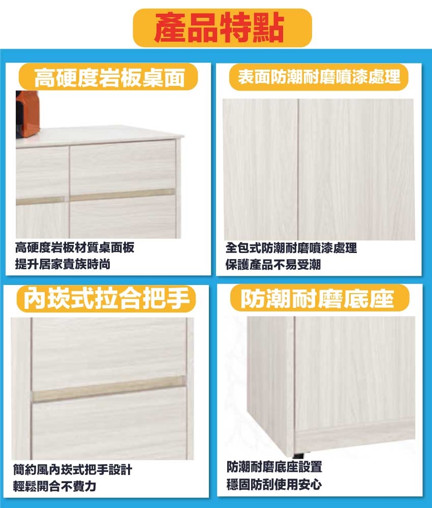 材質:防蛀木心板+防潮耐磨腳座+防夾手緩衝門片五金+12mm高硬度岩板桌面板+五金滑軌結構