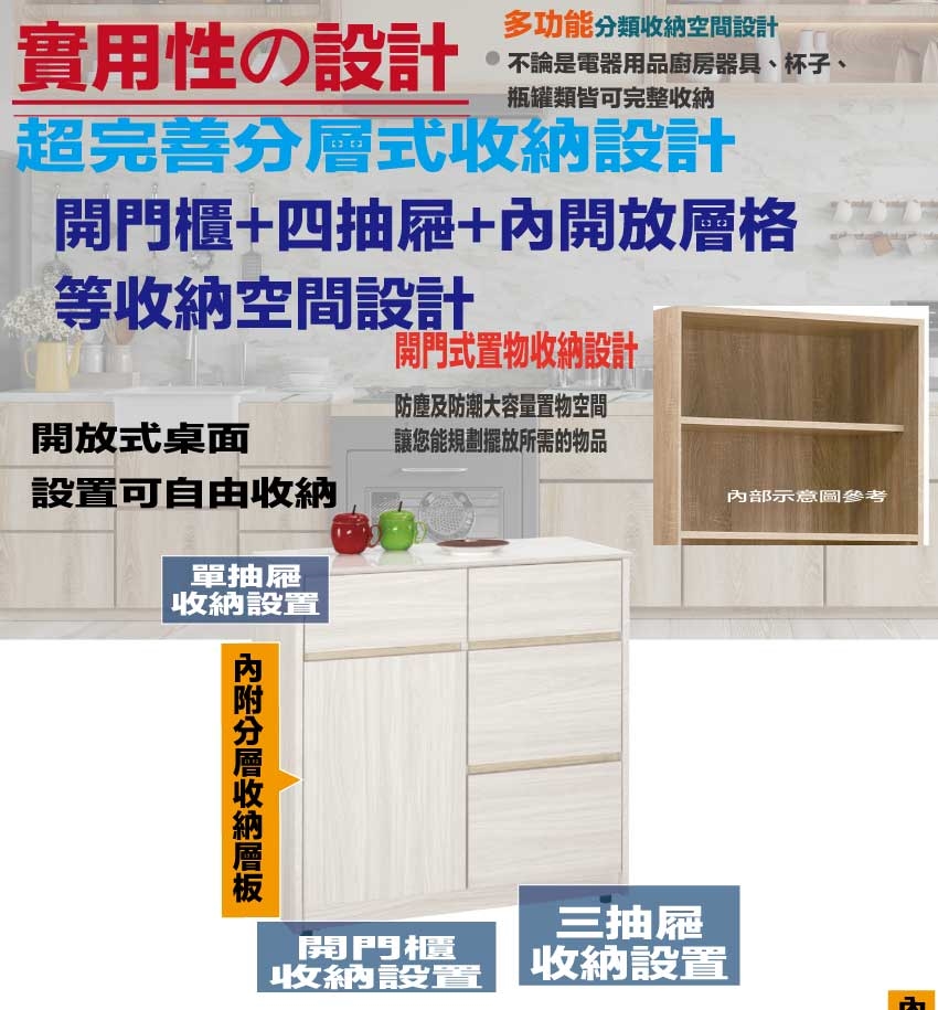 搭配採用開門櫃+四抽屜+內開放層格等收納空間設計