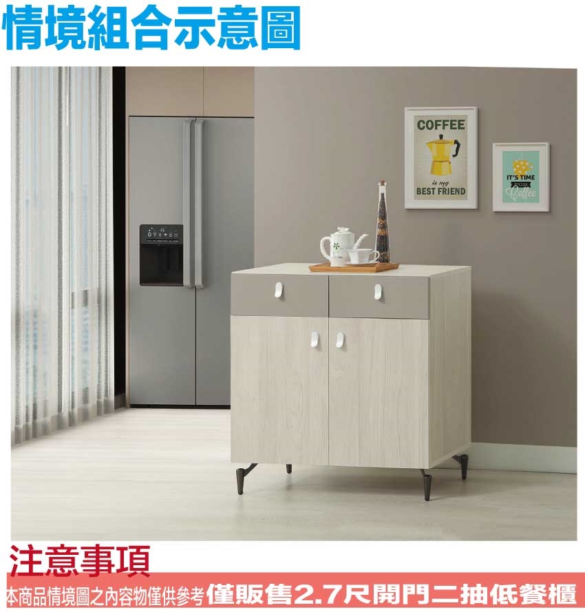 ★偏遠地區需額外加收運費,下標請先問與答詢問★ ★下訂前注意 由於商品流動較快,下訂前請先詢問是否有貨在下訂喔~★ 【綠家居】蒂斯2.7尺二門二抽低餐櫃 現代雙色系+安心材質製造,使用放心+搭配居家更便利,採用防蛀木心板+防夾手緩衝五金+烤漆五金腳座+五金滑軌結構等安心材質製造 ,外層採用防潮耐磨噴漆處理搭配採用開門櫃+二抽屜+內開放層格等收納空間設計,全由專人配送到家,專業安心服務,替你省下更多時間!