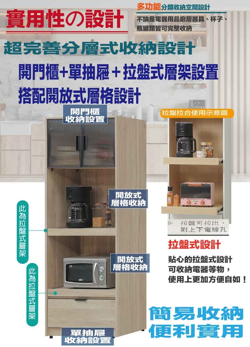 搭配採用開門櫃+拉盤層架+單抽屜+內&外開放層格等收納空間設計