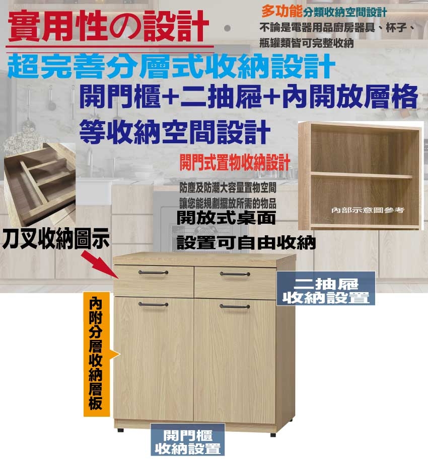 搭配採用開門櫃+二抽屜(含刀叉收納抽)+內&外開放層格等收納空間設計